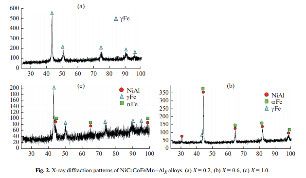 后者可以通过形成基于铝化物的金属间相的“固体”夹杂物来解释。对a = 55±5 g制备的铸造HEA的XRD分析表明,相组成对Al浓度的依赖性(图2)。在X = 0.2时,形成具有fcc结构的单相产物。当X = 0.6-1.0时,燃烧产物由α-Fe(bcc)相,γ-Fe(fcc)相和金属间β-NiAl相组成。