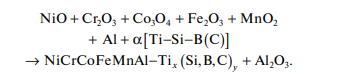 使用含有金属氧化物粉末(NiO,Cr2O3,Fe2O3,Co3O4,MnO2;粒径为50–100μm)和Al(PA-4品牌,粒径小于140μm),Ti,Si的铝热混合物进行SHS。 ,B和C。