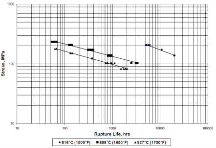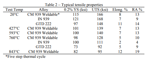 cm939可焊合金的典型拉伸性能如表2所示;典型的应力-破裂特性见表3和图6。标准IN 939[13]和GTD 222[14]合金的性能比较。GTD 222合金(表1[15)是通用电气公司开发的一种替代合金,通常用于类似于in939合金的应用。与标准in939合金相比,GTD 222具有更好的延展性,但强度较低。