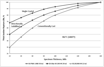 DS铸造技术的进一步扩展是单晶工艺的引入,由Pratt & Whitney Aircraft[2]首创,该工艺消除了所有的晶界,因此,需要晶界强化元素,如C、B、Hf和Zr。由于这些元素是熔点降低剂,因此SX合金的温度性能显著提高。单晶合金用于要求较高的高应力/高温发动机应用,如1”级涡轮叶片和叶片和燃烧室组件。SX铸件的优点包括改善了蠕变、疲劳、氧化和涂层性能,从而使涡轮发动机性能和耐久性更好[2-6]。此外,随着壁厚的减小,单晶合金的厚截面断裂寿命仍然保持较高的比例(图2)[7]。
